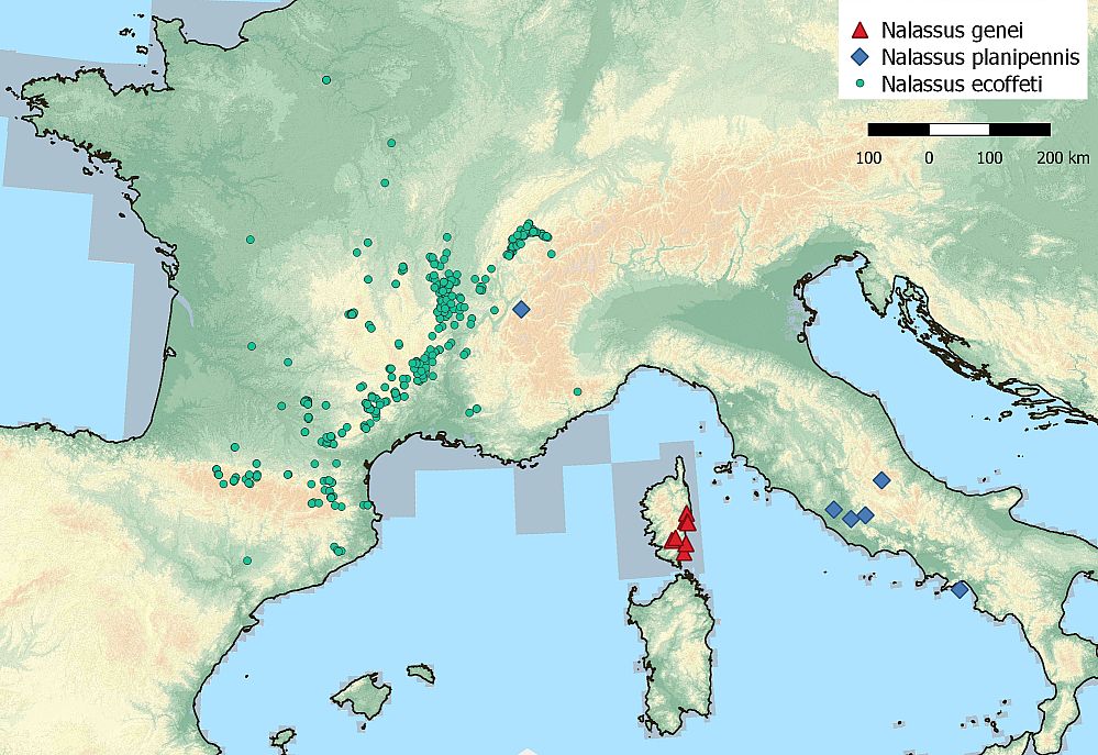 Distribution de trois Nalassus : ecoffeti, genei et planipennis (données géo-référençables seulement. Source : GBIF, données personnelles, publications)